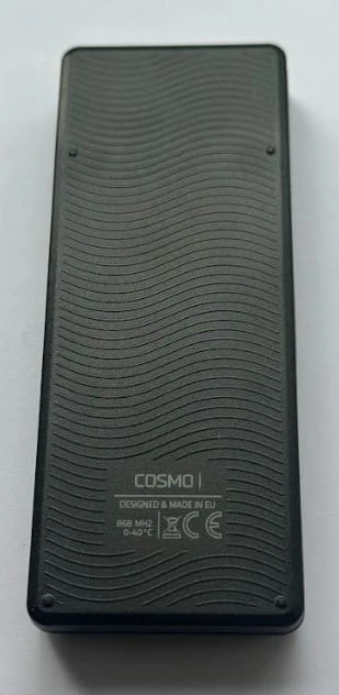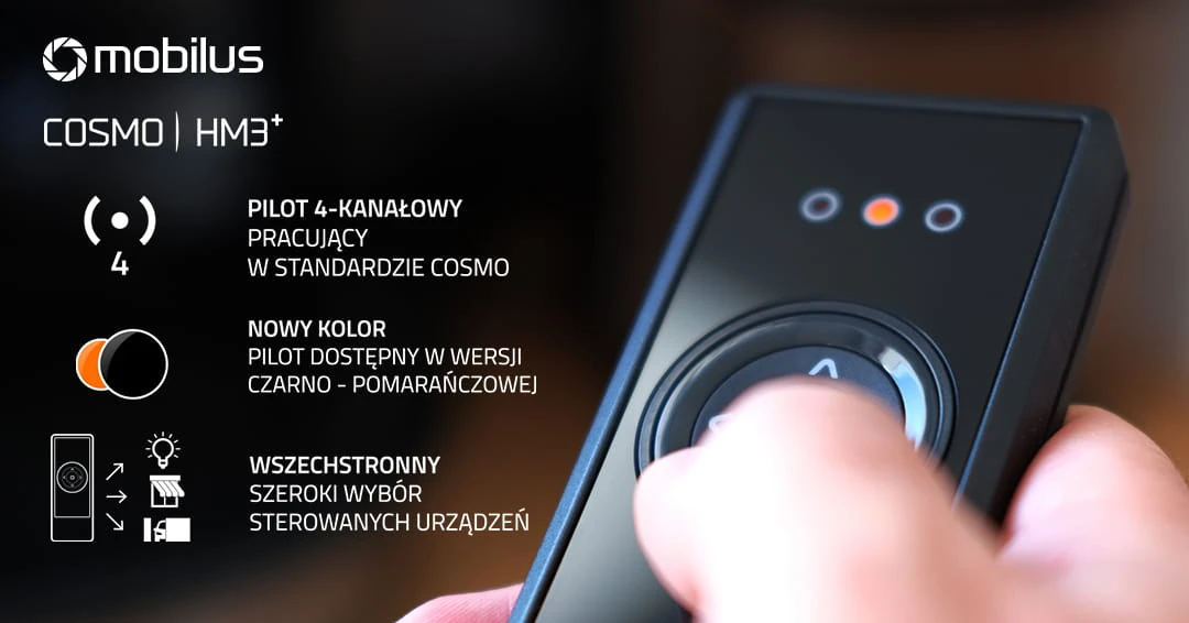 Pilot Cosmo HM3+ posiada 4 kanały i zasięg działania do 40 metrów. Posiada 3 diody LED koloru białego i czarnego oraz kod dynamiczny modulacji FSK 868 MHz. Pilot działa na baterie typu AAA LR03.